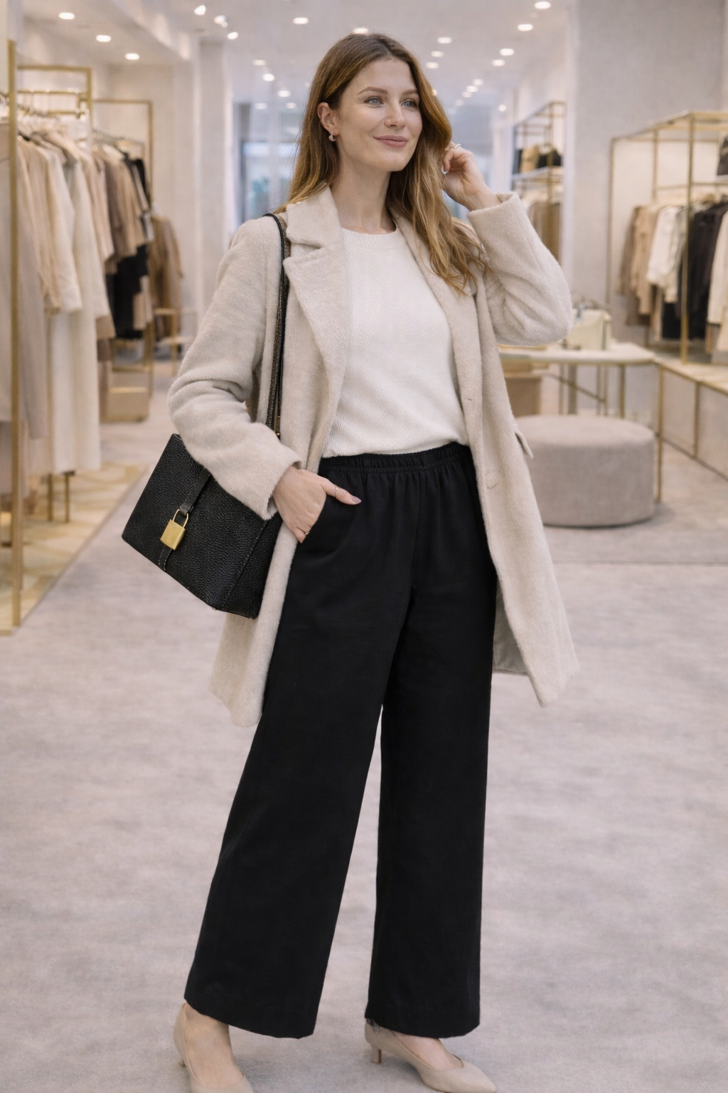 α κομψά παντελόνια άνεσης έχουν σχεδιαστεί για μια στιλάτη και χαλαρή εμφάνιση που συνδυάζει τον σύγχρονο μινιμαλισμό με τη μέγιστη άνεση. Η ελαστική μέση προσφέρει μια ευέλικτη και κολακευτική εφαρμογή, ενώ η φαρδιά γραμμή δημιουργεί μια απαλή πτώση και μια κομψή κίνηση – ιδανικά τόσο για την καθημερινότητα, όσο και για ταξίδια και πιο επίσημες περιστάσεις.